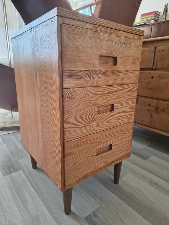 Il mobile presenta tre cassetti profondi, maniglie smussate e gambe inclinate (coniche). Anche queste sono realizzate in legno e noce tinto.