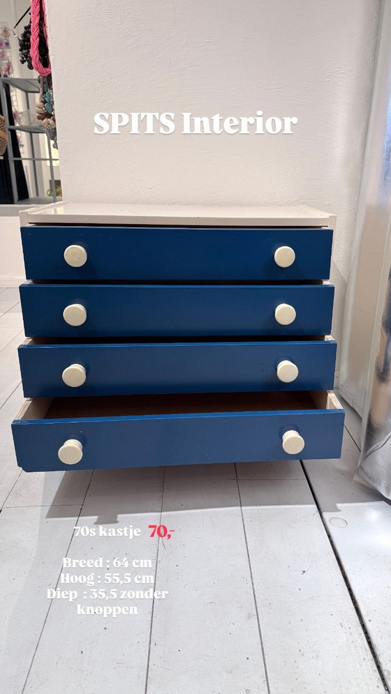 Scopri il fascino degli anni '70 con questa cassettiera vintage! Perfetta per chi desidera portare un tocco vintage nella propria casa. Questa cassettiera combina un vivace colore blu con una finitura bianca brillante, rendendola un vero e proprio elemento di spicco in qualsiasi stanza.