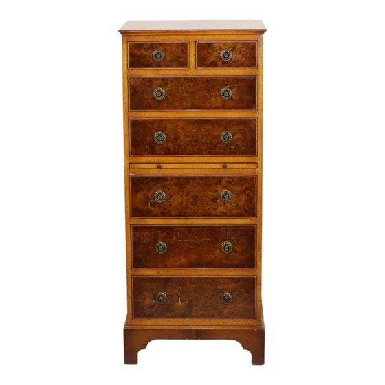 Un robusto comò stretto e alto, realizzato artigianalmente, con 2 cassetti piccoli e 5 cassetti grandi, in ciliegio e impiallacciatura di noce radica, poggiante su gambe a staffa. Basato su un modello antico del XVIII secolo, prodotto da Burton Reproductions Limited, Inghilterra, intorno al 1980, con l'etichetta del produttore all'interno.