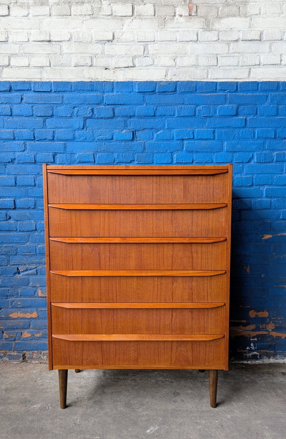 Cassettiera vintage danese in teak, un bellissimo modello di grandi dimensioni con sei cassetti degli anni '60. I cassetti hanno maniglie dalla forma elegante e poggiano su quattro gambe affusolate. La cassettiera è in buone condizioni vintage. Abbiamo acquistato e ritirato di recente questa cassettiera direttamente dalla Danimarca! Una splendida aggiunta a qualsiasi arredamento! Dimensioni: 80x40x110 cm.