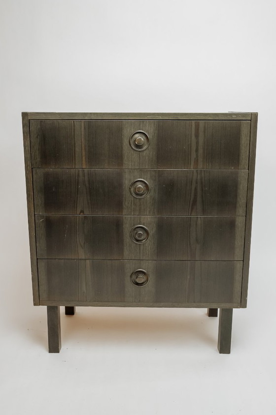 Una cassettiera vintage in legno davvero deliziosa con maniglie in legno intagliato. La cassettiera ha una finitura laccata verde, ma il bello è che si possono ancora vedere le venature del legno. In condizioni eccellenti!