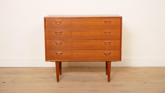 Una fantastica cassettiera vintage danese, disegnata da Kai Kristiansen. I quattro cassetti presentano splendide maniglie, caratteristiche dello stile di Kai Kristiansen. Questo la rende un mobile elegante e senza tempo.