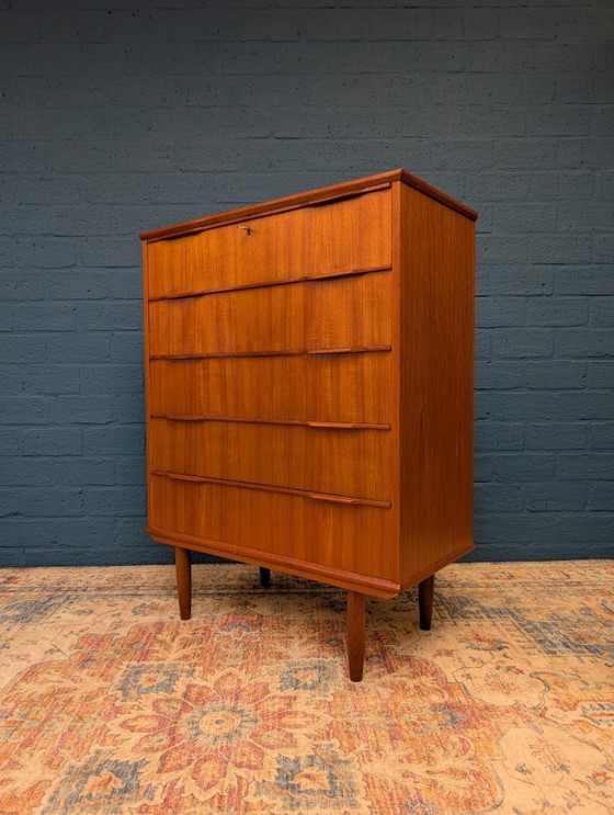 Questa cassettiera danese presenta splendidi dettagli. Presenta venature del legno di pregio, in particolare sul piano. I cassetti presentano anche incastri a coda di rondine.