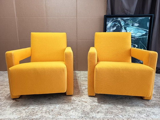 CASSINA Meravigliosa e iconica coppia di poltrone 637 UTRECHT, NUOVE E MAI USATE. Rivestite in morbida lana KVDRAT gialla, disegnate da T. G. Rietveld nel 1935 e presentate al pubblico nel 1936. Raffinatezza ed eleganza ai massimi livelli, in ogni dettaglio della sua costruzione. Rivestite in pregiata e morbida lana KVDRAT, dall'eccezionale qualità tattile. La poltrona Utrecht, che oggi compie 90 anni, rimane un classico senza tempo del design mondiale. Famosa per le sue forme geometriche essenziali, questa iconica poltrona illustra perfettamente lo stile neoplasticista minimalista e funzionale. Utrecht presenta una struttura in acciaio, accuratamente imbottita in poliuretano espanso e ovatta di poliestere, offrendo un duplice rapporto tra comfort ed estetica. La delicata e distintiva cucitura Punto Cavallo esalta le linee pure e squadrate della poltrona e la sua comoda seduta. Il tutto con un tocco sottile e sobrio di estrema eleganza.