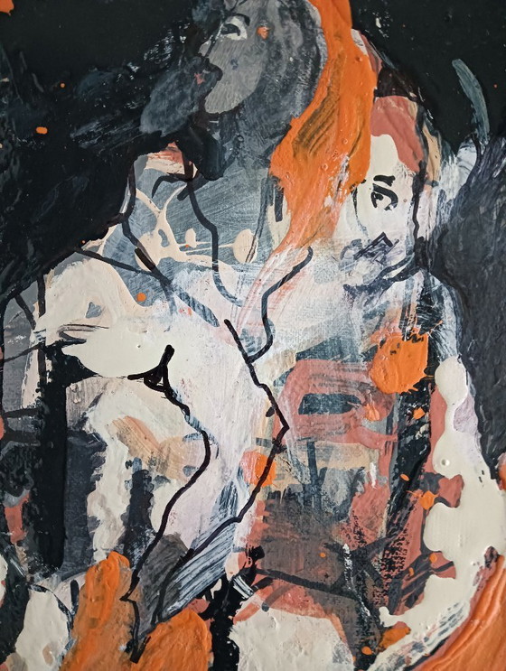 - Questo dipinto è uno splendido esempio di espressione astratta, che combina armoniosamente nero, arancione e bianco.