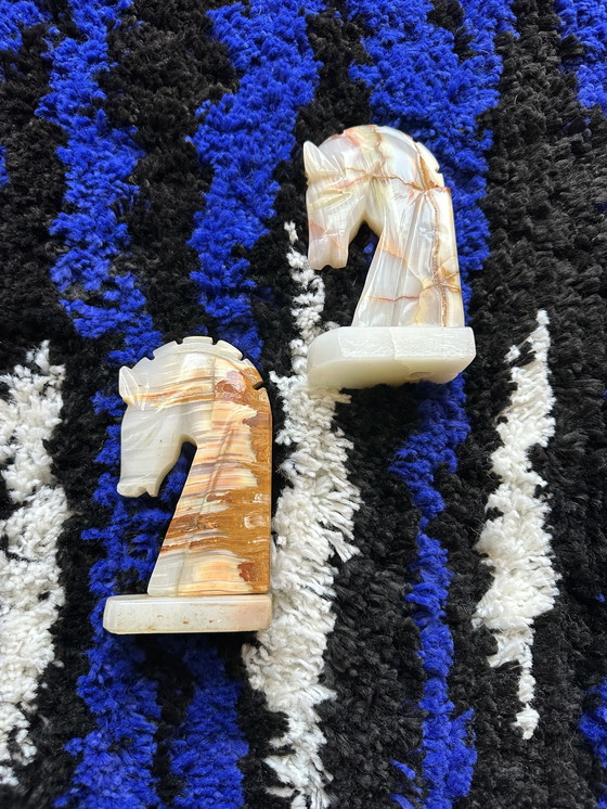 Cavalieri unici in onice naturale intagliati a mano, probabilmente provenienti dall'Asia meridionale o dal Nord Africa (anni '70-'90).