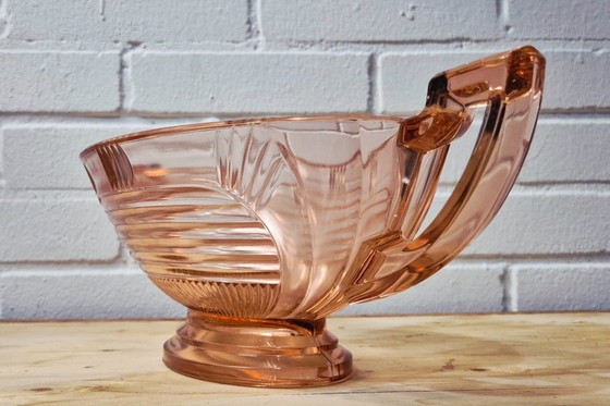 Esalta i tuoi interni con questa splendida ciotola centrotavola vintage Art Déco, realizzata in delicato vetro rosa "Rosalin". Questo pezzo è un esempio per eccellenza della lavorazione del vetro dei primi del XX secolo, con audaci linee geometriche e una silhouette architettonica che definisce l'epoca Art Déco.