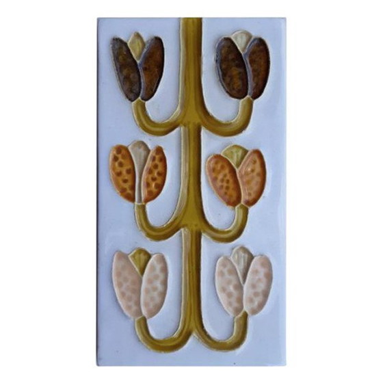 Ceramiche d'epoca di Roger Capron, artista ceramista di fama mondiale. Fiori stilizzati in colori freschi e tenui (bianco, arancione, verde anice, rosa) in piastrelle da 15 x 8 cm. Tutte le piastrelle portano il nome di Roger Capron. Le piastrelle possono essere integrate in una parete o incorniciate e appese come un quadro. Dimensioni: 8 x 15 cm. Ottime condizioni.
