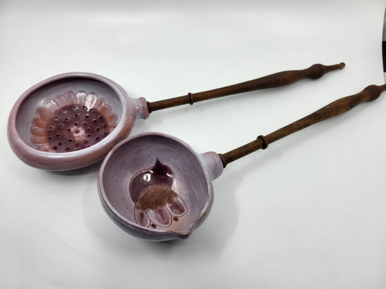 Questo elegante mestolo per punch o sangria presenta un manico in faggio massiccio accuratamente tornito e mordenzato e una testa semisferica in ceramica smaltata all'interno. In perfette condizioni, è accompagnato da uno scolapasta o colino in ceramica abbinato, rendendo questo duo una scelta ideale sia per l'uso pratico che per la decorazione raffinata. Anche se il manico del mestolo presenta una leggera mancanza di legno e una piccola fessura che deve essere rinforzata se appeso, ciò non toglie nulla al suo carattere eccezionale. Il colino ha un diametro di 14 cm e un'altezza di 44 cm, mentre il mestolo ha un diametro di 12 cm e un'altezza di 41 cm. Questi oggetti rari aggiungeranno un tocco di raffinatezza alla vostra tavola o al vostro spazio vitale.