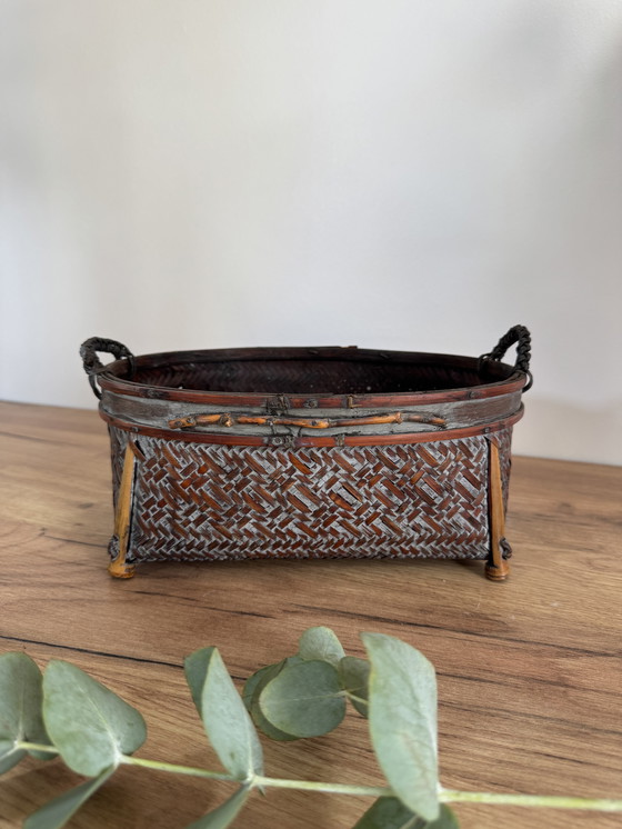Cestino rustico asiatico in rattan e bambù, intrecciato a mano, 📌 Buone condizioni 📏 Dimensioni: 21 x 27 cm / Altezza: 11 cm
