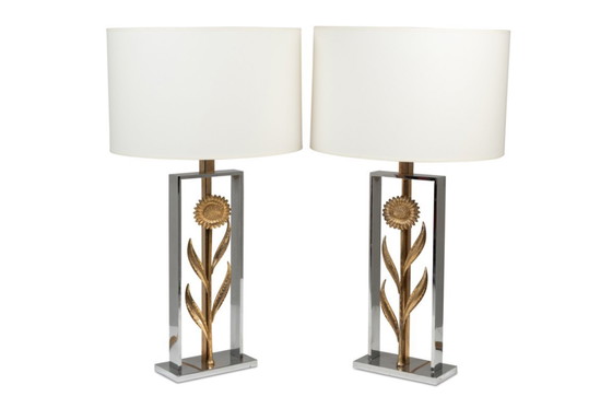 Coppia di lampade in bronzo dorato e metallo cromato, con motivo a girasole.