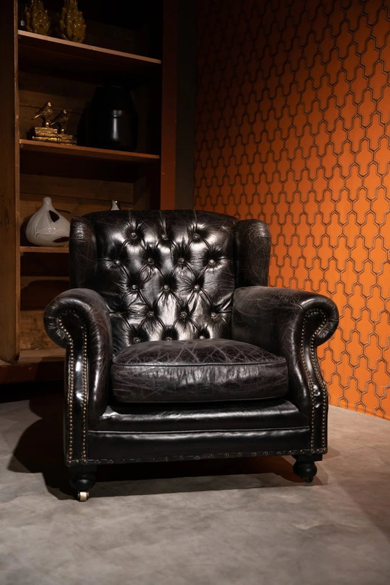 Questa poltrona Chesterfield di Timothy Oulton è un mobile classico che emana eleganza e raffinatezza. Realizzata in pelle nera di alta qualità, presenta l'iconica imbottitura a bottoni e i braccioli arrotolati che definiscono lo stile Chesterfield. La pelle ha una finitura craquelure che le conferisce un aspetto unico e vintage. Perfetta per aggiungere un tocco di lusso a qualsiasi spazio abitativo, questa poltrona è comoda ed elegante.