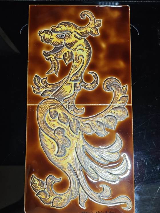 Questo pannello murale è composto da due piastrelle in ceramica che formano un'affascinante creatura fantastica (chimera o drago). I suoi superbi rilievi e le calde smaltature (oro, ocra e marrone scuro) completeranno perfettamente un arredamento che fonde stili vintage e contemporanei. Una vera opera di arte popolare basca, tipica della produzione dagli anni '50 agli anni '70.