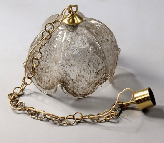 Lampada a sospensione Kaiser vintage degli anni '70, caratterizzata da un bellissimo paralume in vetro con superficie strutturata. La lampada è sospesa da una catena in metallo dorato, che aggiunge eleganza al suo design. Il suo vetro trasparente permette di ottenere una luce calda e invitante, rendendola un'aggiunta perfetta a qualsiasi interno di ispirazione retrò o vintage. Il ciondolo è in ottime condizioni, con lievi scolorimenti che ne esaltano il fascino antico.