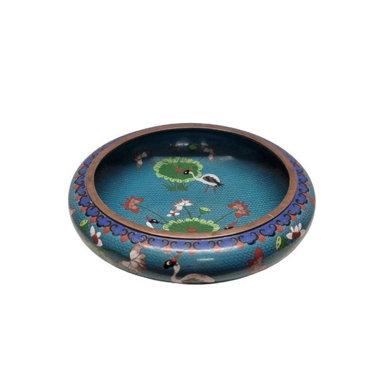 Questa esclusiva ciotola cloisonné con gru è un oggetto straordinario, realizzato in Cina tra la fine del XIX e l'inizio del XX secolo. La ciotola è riccamente decorata con gru, motivi floreali ed eleganti motivi a nuvole, eseguiti con la tradizionale tecnica dello smalto cloisonné su rame. La ciotola è marchiata sul fondo, a indicarne la provenienza e l'autenticità. È in ottime condizioni, con smalto brillante, colori ben conservati e usura minima coerente con la sua età.