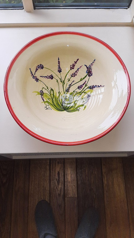 Questa splendida ciotola in ceramica, decorata con un delicato motivo a lavanda, dona un tocco di raffinatezza a qualsiasi ambiente. I fiori viola dipinti a mano creano un magnifico contrasto con lo sfondo color crema, mentre il bordo rosso aggiunge un tocco di colore delicato. Perfetta sia per uso decorativo che funzionale, questa ciotola è un'opera d'arte in sé.