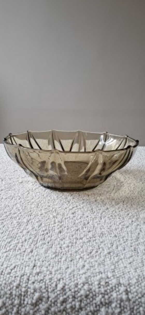 Elegante insalatiera antica in vetro temperato, color grigio/marrone fumé. Presenta alcuni micrograffi, ma nel complesso ha un aspetto splendido.