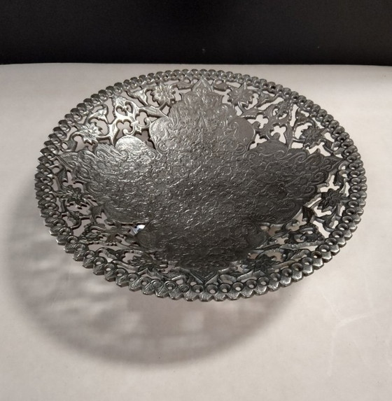 Questa splendida ciotola in metallo presenta un motivo floreale splendidamente intagliato.