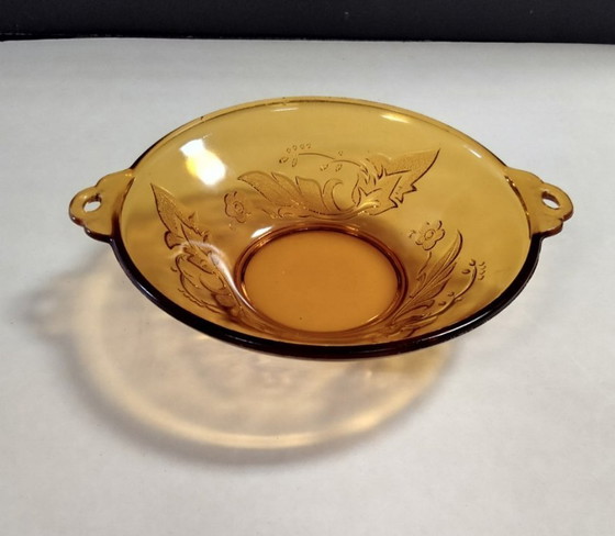 Questa splendida ciotola vintage in vetro ambrato con manici è un'aggiunta raffinata a qualsiasi tavola. Il caldo colore ambrato emana un'eleganza senza tempo, mentre i delicati motivi decorativi aggiungono un tocco di raffinatezza.