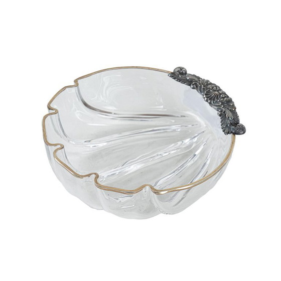 Un'elegante ciotola trasparente dalla forma organica a conchiglia, realizzata in vetro modellato con scanalature decorative a spirale. Il bordo è leggermente ondulato, impreziosito da una doratura. Una sezione del bordo è decorata con un elemento metallico (probabilmente argentato) con un motivo di foglie d'acanto e fiori. L'oggetto aveva una funzione decorativa: poteva essere utilizzato come zuccheriera o come vaso ornamentale.