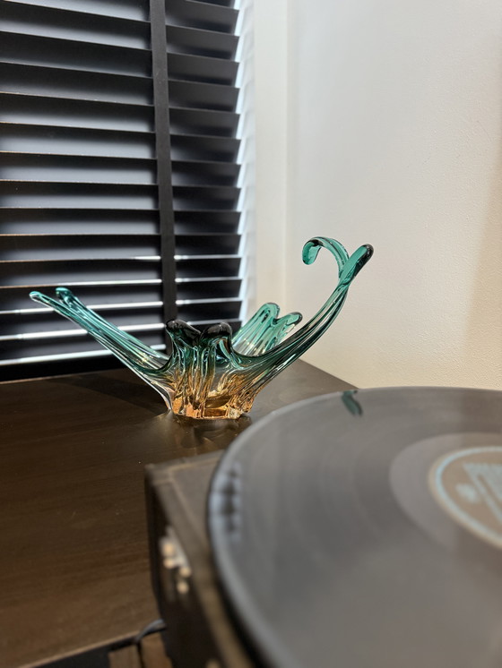 Grande ciotola in vetro di Murano dalle forme aggraziate. Colore: verde/ocra. Dimensioni: 53x32x23 cm (LxPxA). In ottime condizioni, lievi segni di usura, solo qualche piccolo graffio.