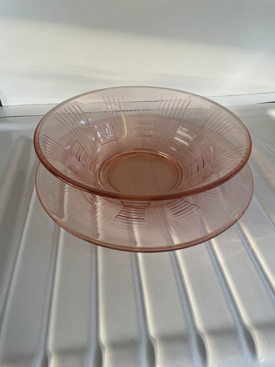 Molto raro, soprattutto se in set completo. Non troverete un secondo modello belga degli anni '30, splendido esemplare del periodo Art Déco, realizzato in vetro pressato color salmone con una decorazione stilizzata. Questa ciotola è stata probabilmente prodotta a Val Saint Lambert / Luxval.