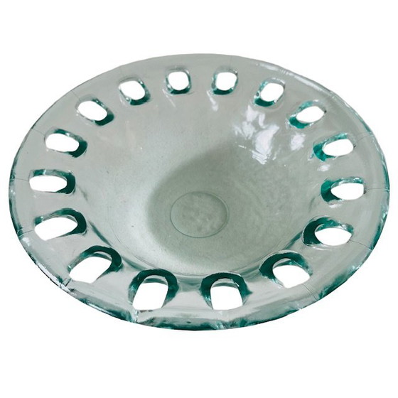 Ciotola vintage spagnola in vetro riciclato, realizzata a mano negli anni '50. La ciotola di metà secolo ha un colore turchese trasparente e presenta ritagli intorno al bordo.