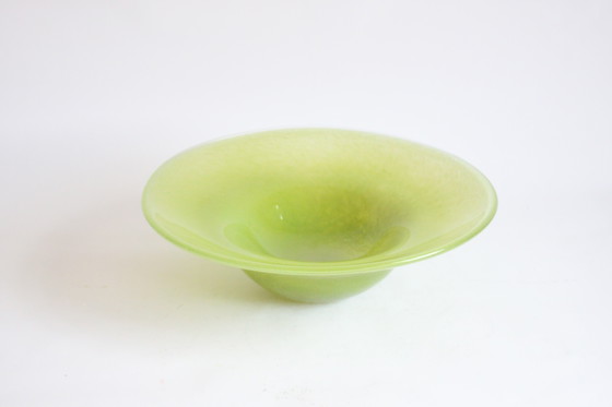 Centrotavola in vetro Henry Dean. Vetro soffiato a mano con sfumature di verde più scure e intense al centro. Più chiaro verso i bordi. Firma Henry Dean sul fondo, così come l'etichetta dell'azienda.
