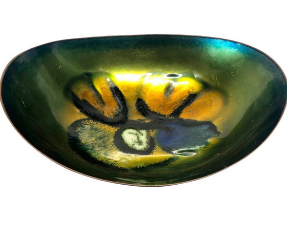 Questo pezzo unico è realizzato in metallo leggero con una vivace finitura in smalto, che mostra splendide tonalità iridescenti nei toni del verde, dell'oro e con accenti scuri. Il motivo astratto e organico e la superficie riflettente sono tipici dell'arte decorativa italiana di metà secolo.