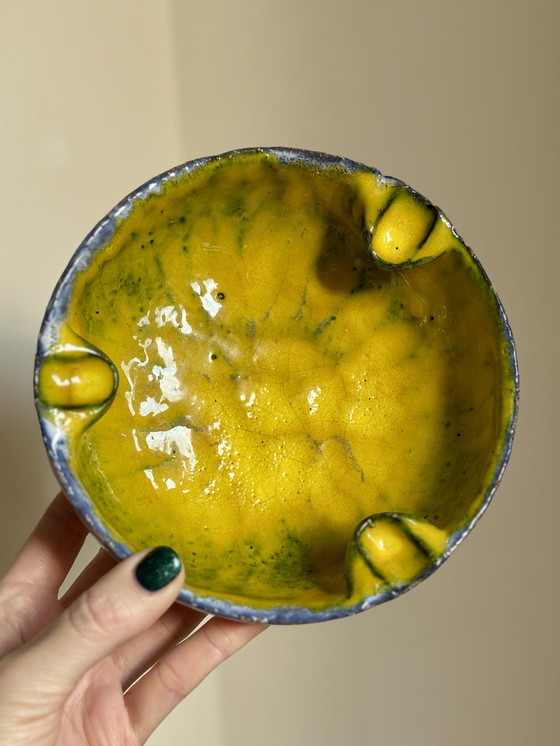 Questo è un pezzo vintage davvero affascinante e di carattere, un esempio di lavoro in studio su piccola scala. L'interno è giallo con verde e ha un bordo blu, mentre l'esterno è marrone con smalto bianco. Caratteristici sono i tre incavi, originariamente destinati alle sigarette, ma ora questa ciotola è ideale come oggetto decorativo o per riporre piccoli oggetti come gioielli o chiavi.
