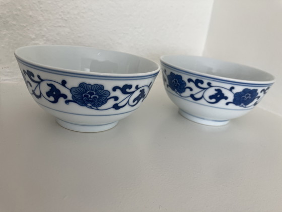 Due ciotole cinesi in porcellana con classico decoro floreale bianco e blu, ispirato alla dinastia Ming. Le ciotole sono state realizzate tra il 1990 e il 2010 e presentano un marchio quadrato sul fondo. Il materiale è porcellana bianca di alta qualità con decori blu sottosmalto. Le condizioni sono eccellenti: nessun danno o usura. Adatto come oggetto ornamentale o per uso quotidiano.