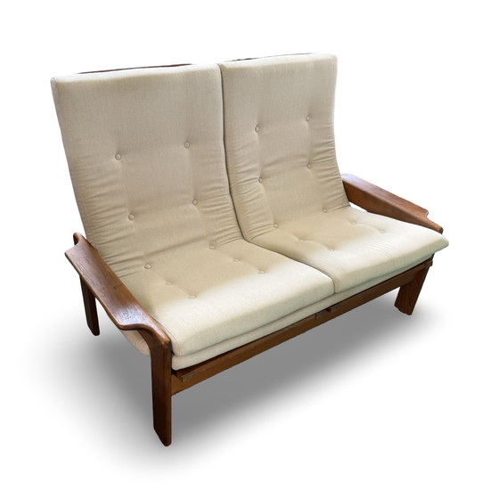 Divano vintage a due posti con schienale alto, prodotto in Danimarca. Il designer/produttore esatto è sconosciuto. Il rivestimento è stato pulito e la struttura in legno è stata riverniciata, così che il nuovo proprietario possa goderne per molti anni a venire! Al momento della stesura di questo testo, ne abbiamo due in magazzino, il prezzo si intende per singolo pezzo.