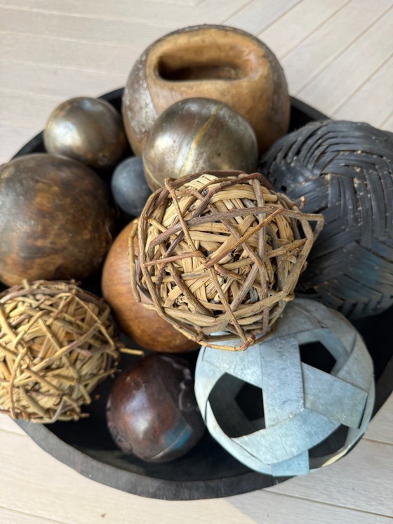 Collezione di 11 palline e sfere decorative. Legno, ferro, paglia, gomma, legno trattato/grezzo, legno da bowling. Varie dimensioni, texture e materiali. Insieme formano un grazioso set decorativo. Possono essere utilizzate anche separatamente.