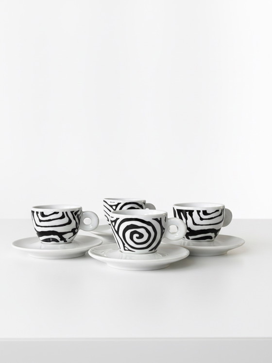 In vendita: Tazzine da caffè espresso Illy Collection 1995 di Roberta Pietrobelli, 4 tazzine in 2 modelli, piattini inclusi.