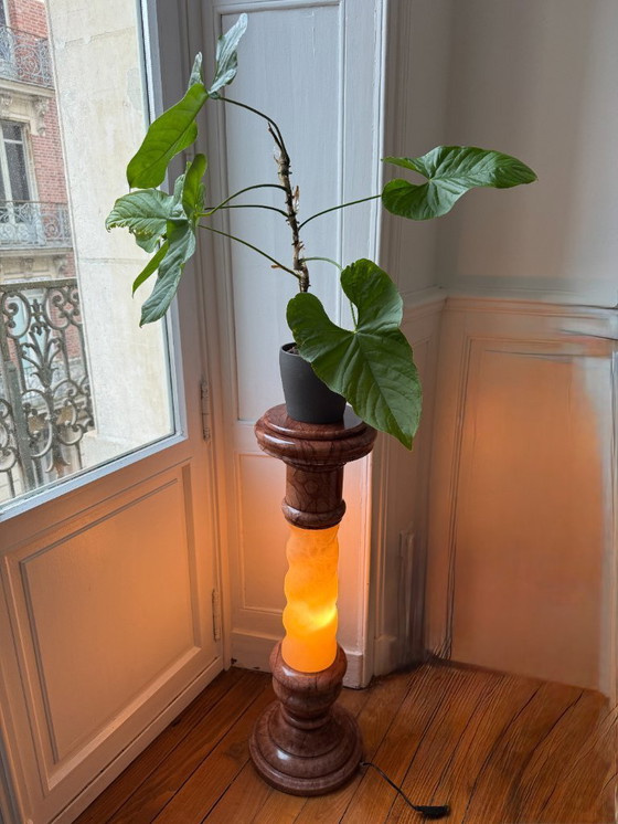 Questa colonna luminosa in alabastro diffonde una luce morbida e calda che trasforma istantaneamente l'atmosfera di una stanza. È il tipo di oggetto che calma, riscalda e cattura lo sguardo.