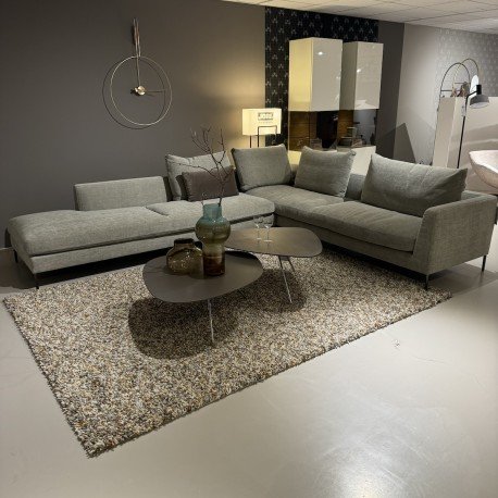 Divano angolare Montis Daley a 4 posti con 2 braccioli, dormeuse a 4 posti, pouf a sinistra, 3 cuscini decorativi 75x50 cm, 1 cuscino decorativo 100x50 cm, 1 rullo di supporto 75 cm. Realizzato in tessuto Bristi colore 75. Gambe cromate nere lucide.