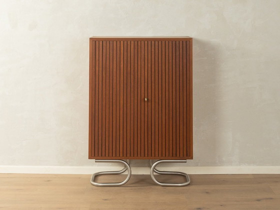 Rara cassettiera degli anni '50 di Oldenburger Möbelwerkstätten. Corpo in teak impiallacciato con due ante scanalate, due ripiani e nuovi piedini in acciaio inox in stile Bauhaus.