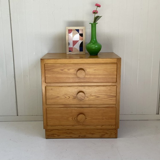 Cassettiera in legno, ha 3 cassetti scorrevoli con grandi pomelli rotondi, tipici degli anni '70. Bello come comodino, ma anche per esempio nell'ingresso per le chiavi, ecc. Presenta i normali segni d'uso, adeguati all'età.