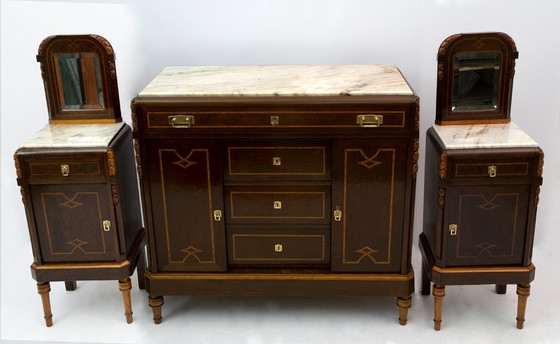 Bellissimo set da camera da letto, composto da una coppia di comodini e un comò in radica di tuia, intarsi in acero e piano in marmo rosa del Portogallo, produzione italiana degli anni '20. Il set è stato restaurato e lucidato a gommalacca. I comodini misurano 126 cm di altezza con specchi e 86 cm senza specchi.