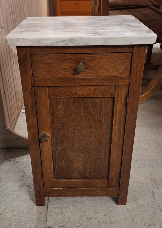 Bellissimo mobiletto antico in legno con piano in marmo rimovibile. In buone condizioni vintage. Ideale come comodino o tavolino. Molto robusto, con legno splendidamente invecchiato.