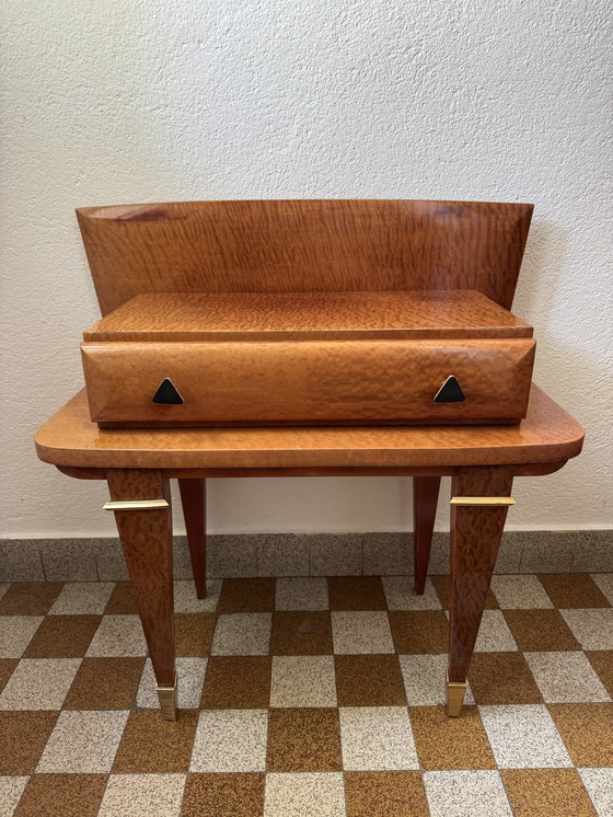 Elegante comodino Art Déco/modernista degli anni '50 in radica bionda verniciata, finiture in ottone e cassetto interno in feltro rosso con pomelli triangolari, in ottime condizioni (un piccolo segno di usura su un angolo: vedi foto).