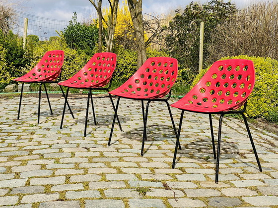 Sedie Pierre Guariche Coquillage, prodotte da Meurop, Belgio. Il design è un bellissimo esempio di design industriale di metà secolo. La scocca e la seduta in plastica rossa a vista ne enfatizzano il carattere vintage senza comprometterne la qualità. Sono in condizioni ragionevolmente buone, con segni di usura adeguati alla loro età. Un'aggiunta preziosa per collezionisti e appassionati di design di metà secolo.
