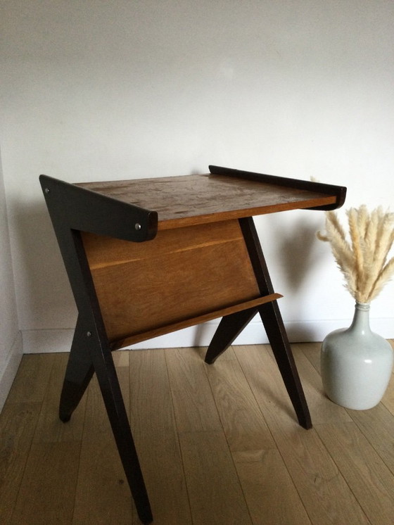 Il contrasto tra i montanti scuri e il legno più chiaro del piano evidenzia un'estetica pulita e architettonica, oggi molto ricercata dagli amanti dell'arredamento vintage e del design italiano.