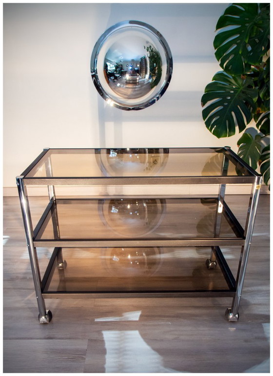 Un pezzo di alta qualità, prodotto in Francia negli anni '80 da ERARD: tre ripiani in vetro fumé incorniciati da una robusta struttura in metallo nero e cromato, il tutto su rotelle cromate.