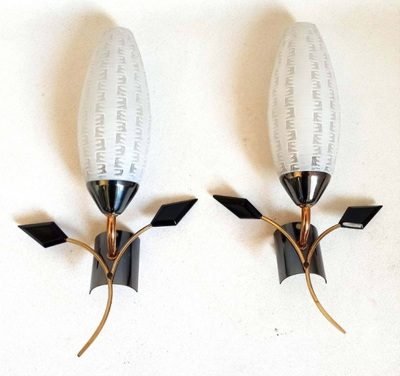 Realizzate in vetro, bachelite, ottone e metallo, queste applique si distinguono per il design raffinato e la finitura oro e nero, tipici dell'epoca.