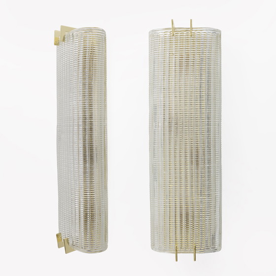 Coppia di applique in vetro di Murano trasparente texturizzato. Il vetro è scanalato e curvato, creando un impatto superbo racchiuso in una lastra di vetro, in stile Art Déco. La struttura portante è in ottone placcato oro puro. Ogni applique richiede quattro lampadine con attacco medio (E27 o E26) ed è cablata secondo gli standard statunitensi ed europei. Altre coppie disponibili; chiedere la disponibilità.