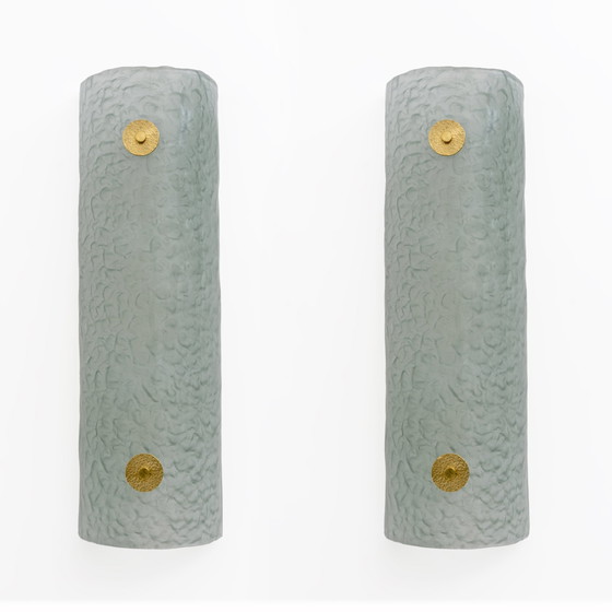 Coppia di applique in vetro di Murano verde acqua con retro satinato e aspetto testurizzato. Ogni lampada è realizzata in un unico vetro curvato, sostenuto da due bulloni in ottone. Sono di alta qualità ed emanano una piacevole luce calda. Ogni lampada contiene quattro lampadine a attacco medio (E27/E26) ed è cablata secondo gli standard europei e statunitensi. La piastra di supporto a parete misura 50 x 3 cm. Disponibili diverse coppie, chiedere per la disponibilità, rimanenze di magazzino.