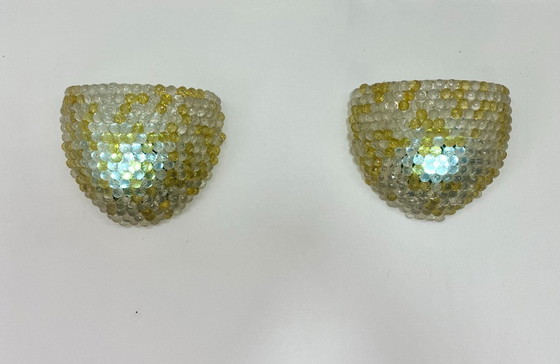 Una splendida coppia di applique anni '70, decorate con perline gialle e trasparenti.