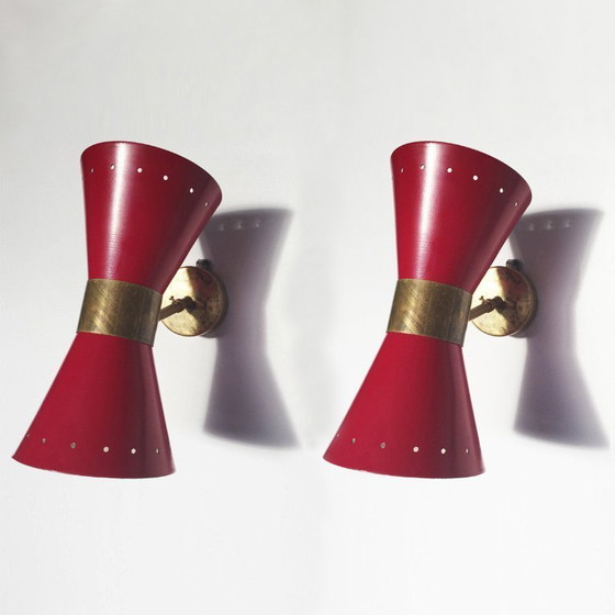 Coppia di lampade da parete nello stile del design italiano degli anni '50. Doppia illuminazione su ciascun lato. Le teste delle applique possono essere regolate in verticale o in orizzontale a seconda delle esigenze. Dimensioni: - altezza: 22 cm - diametro del paralume: 12 cm - diametro della calotta: 7 cm - lunghezza dell'asta: 10 cm - profondità della calotta: 2 cm - diametro dell'anello intorno al paralume: 7 cm = profondità totale: 19 cm. Lampadine E14. Condizioni perfette