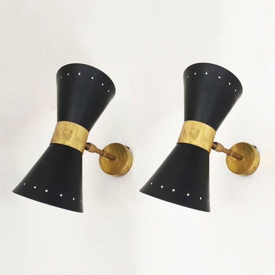 Coppia di applique nello stile del design italiano degli anni '50. Doppia illuminazione su ciascun lato. Le teste delle applique possono essere regolate in verticale o in orizzontale a seconda delle esigenze. Dimensioni: - altezza: 22 cm - diametro del paralume: 12 cm - diametro della calotta: 7 cm - lunghezza dell'asta: 10 cm - profondità della calotta: 2 cm - diametro dell'anello intorno al paralume: 7 cm = profondità totale: 19 cm Lampadine a vite. Condizioni perfette